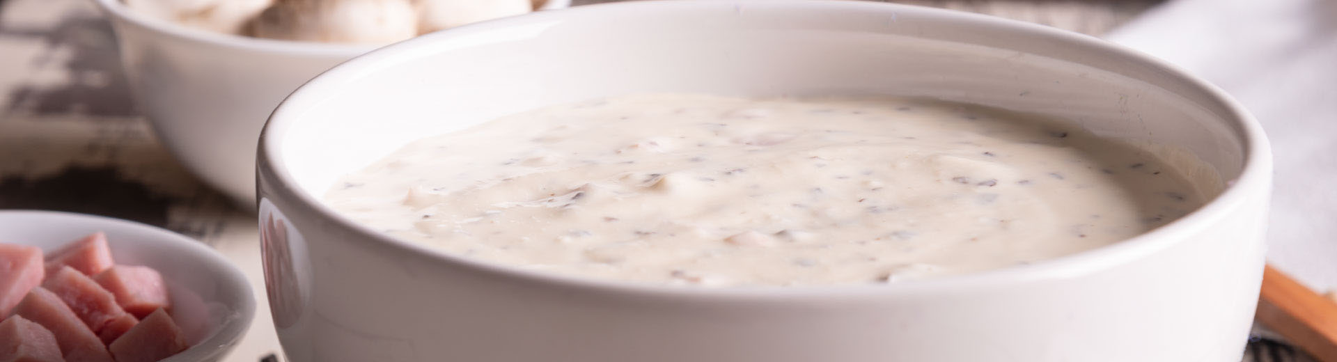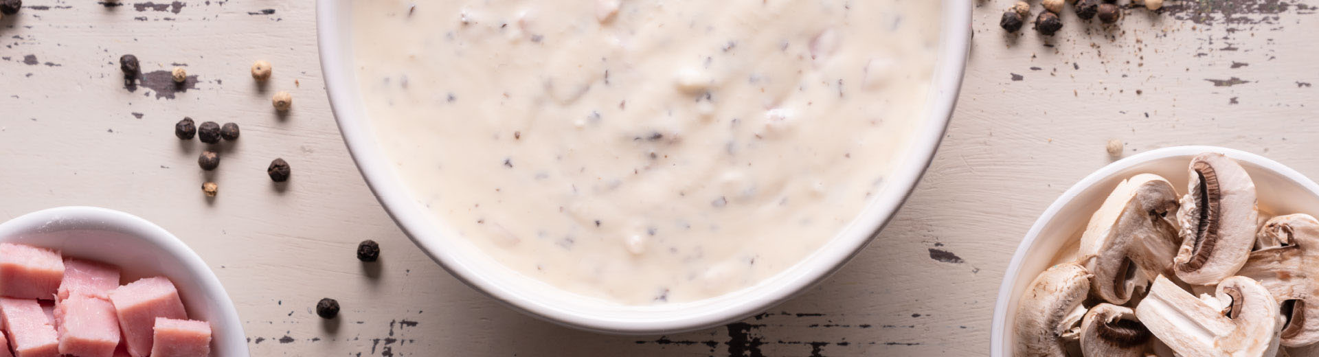 Crema de leche, champignones, jamón cocido, harina, sal, pimienta, nuez moscada